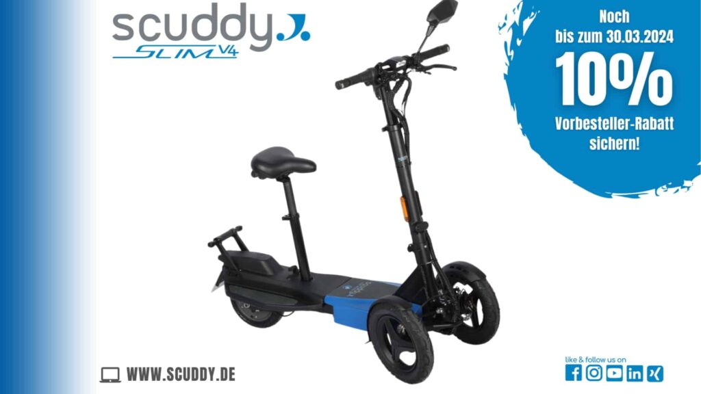 Insgesamt markiert die Einführung des scuddy SlimV4 einen Meilenstein in der Entwicklung von Elektrofahrzeugen. Mit seiner innovativen Technologie, höchster Qualität und einem attraktiven Design setzt der SlimV4 neue Maßstäbe für Einsteigermodelle. Seien Sie einer der Ersten, die dieses herausragende Fahrerlebnis erleben, und sichern Sie sich jetzt den exklusiven Vorbestellerrabatt. Die Auslieferung ist für April bis Juni 2024 geplant – verpassen Sie nicht die Gelegenheit, Teil dieser aufregenden Reise zu werden!