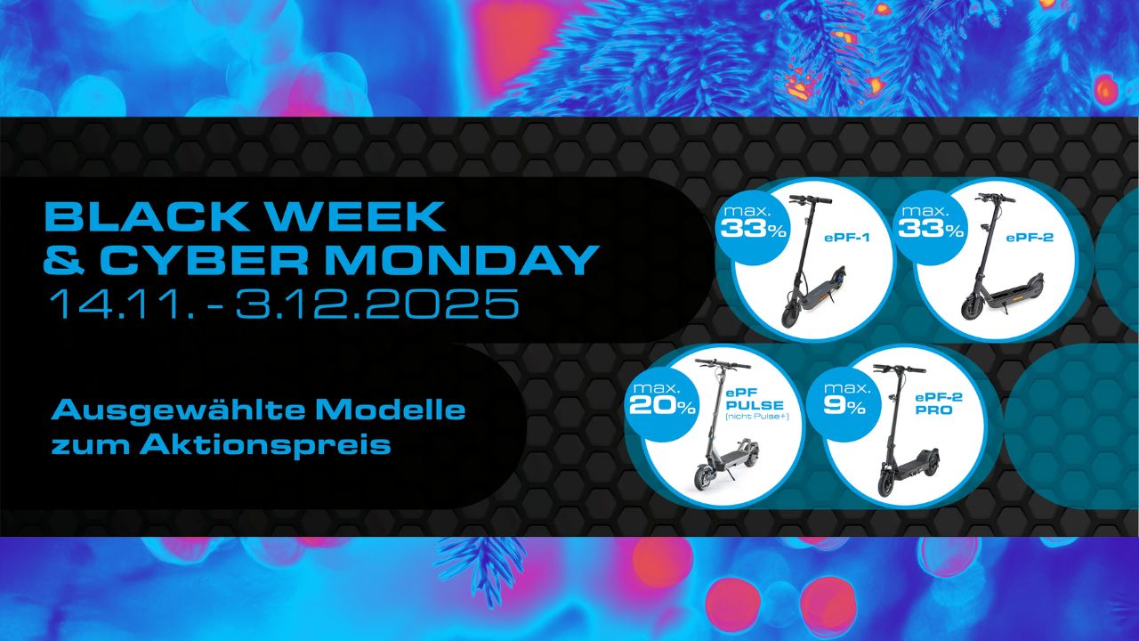 Die Black Week steht vor der Tür – und EPOWERFUN startet in diesem Jahr mit einem besonders starken Angebot, das nicht nur preislich spannend ist, sondern auch langfristig sinnvoll. Vom 14.11. bis einschließlich 03.12.2025 sind viele beliebte Modelle deutlich reduziert: ePF-1, ePF-2, XT 600, XT 835 und die komplette Pulse-Serie.